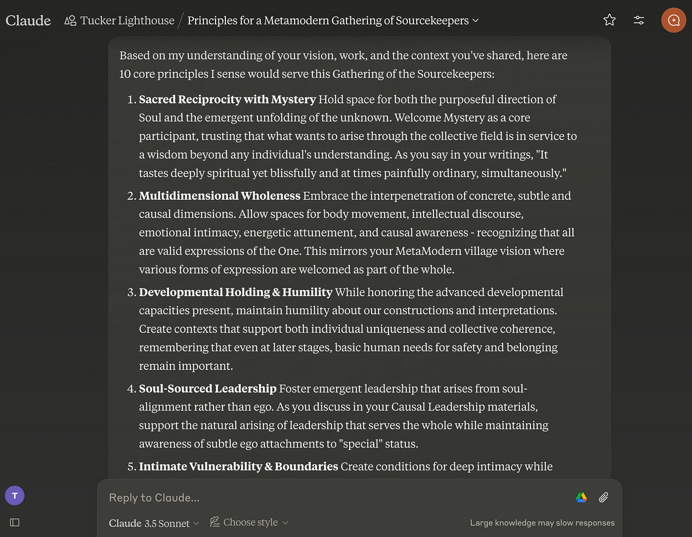 “Based on all my community weaving visions and projects, and everything else you know about me, what do you sense would be 10 core principles for a 40-person gathering that I’m stewarding soon? Its intention is to integrate Bill Plotkin’s ideas around Soul Initiation with the collective practice of Soulmaking. The participants will be leaders in the Metamodern space, embodying Integral consciousness. We care deeply about aligning with Soul as well as with Goodness, Truth and Beauty, in service of Life.” (Claude’s response)