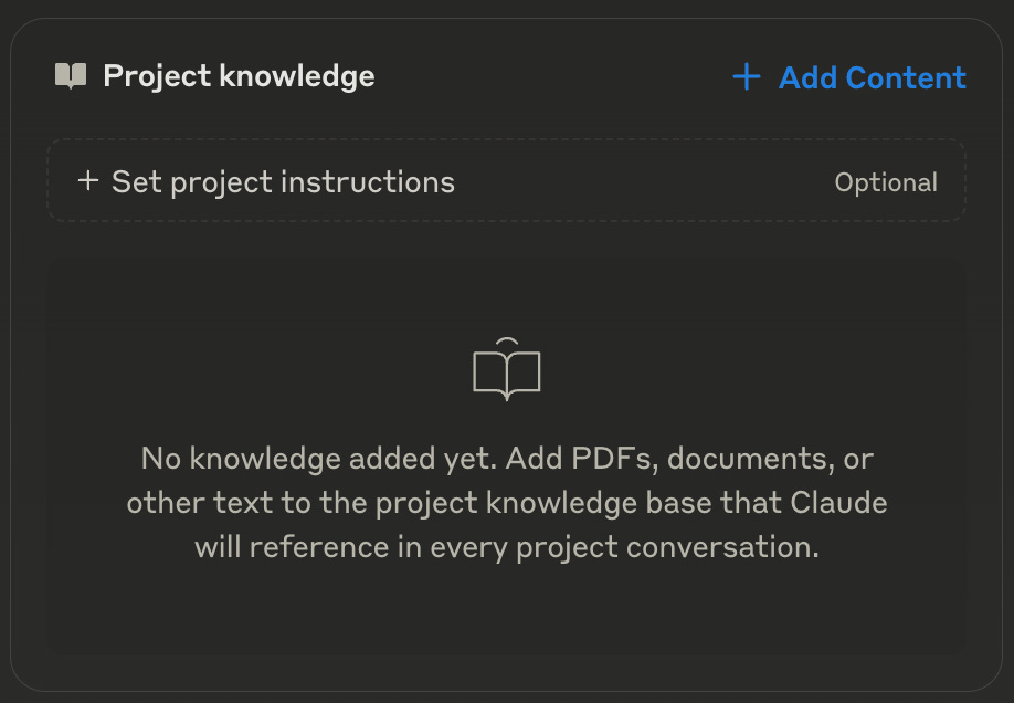 If you’ve already been working with AI and have some amazing conversations in other threads, you can also copy and paste into a doc (or ask AI to summarize the convo) and upload to Claude in your new Project space.