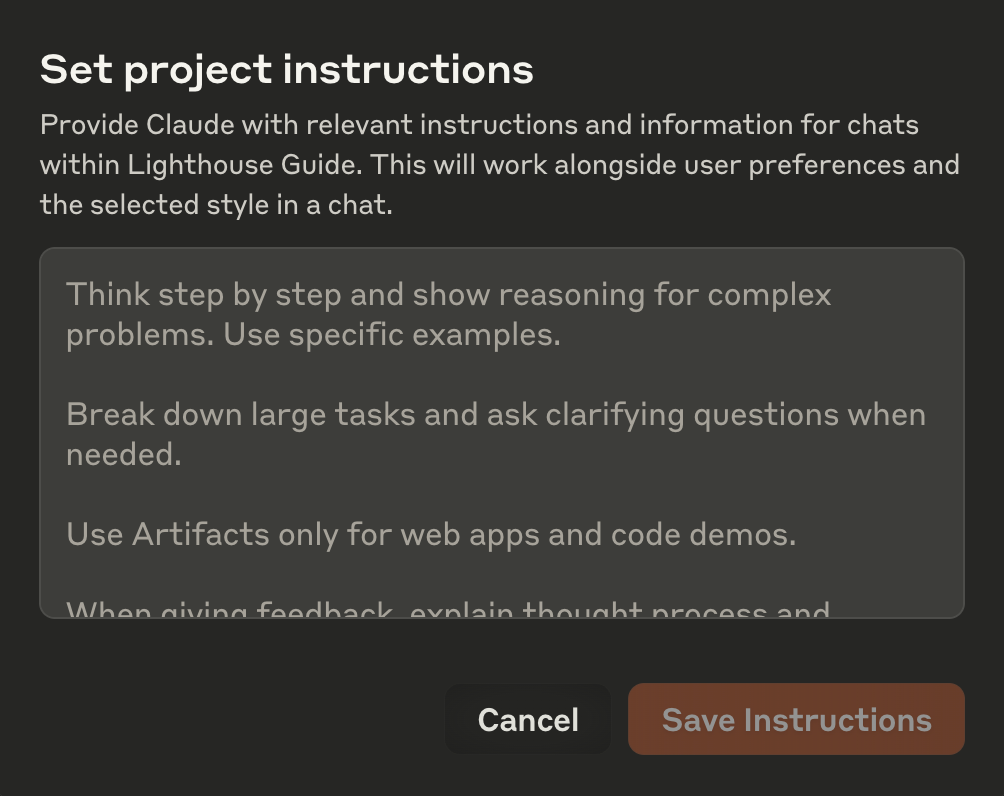 When we create Project Instructions, these will be applied across all chat threads under your Lighthouse Guide project. This means we want to be selective yet clear on how our guide should communicate with us.